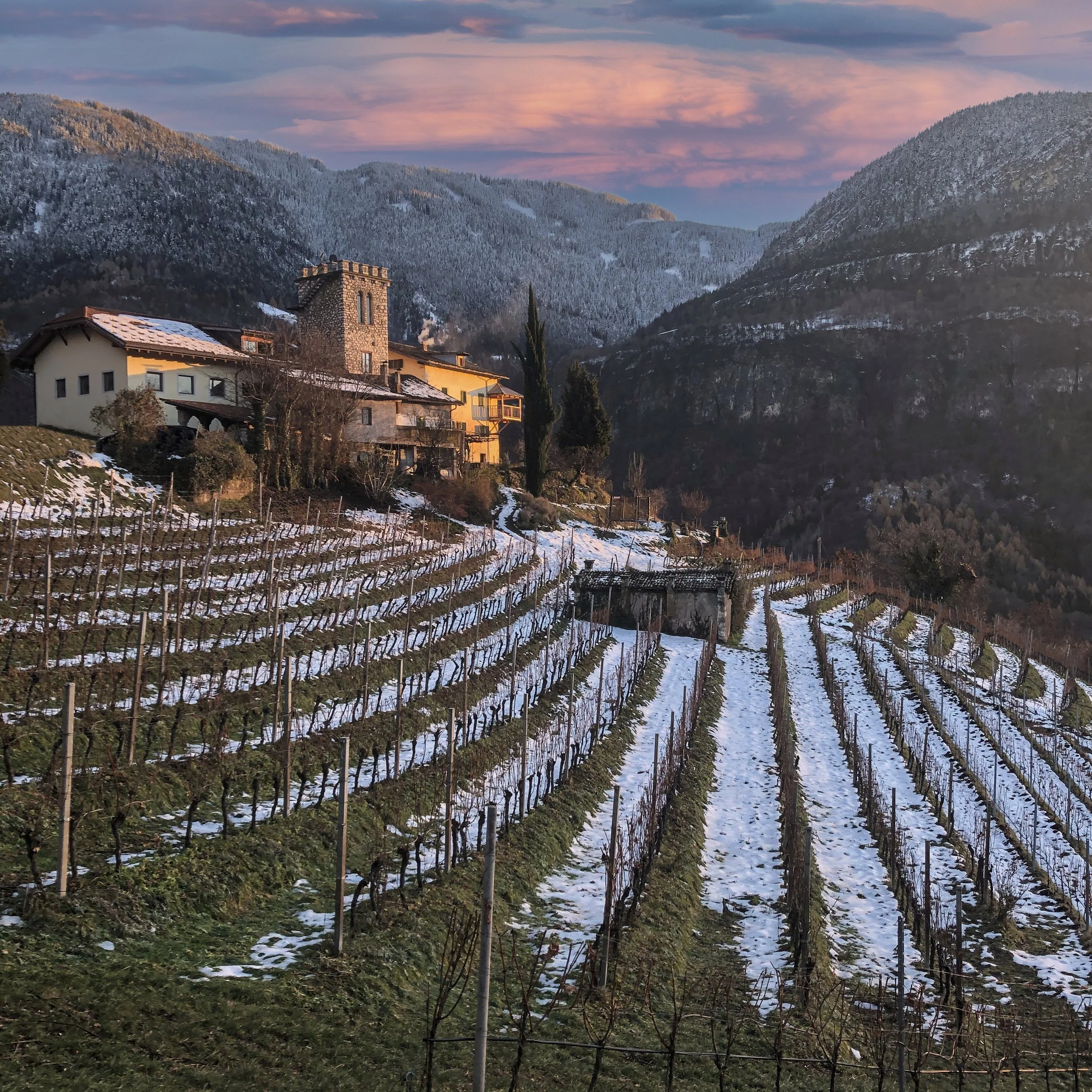 Al centro un maso, le cui origini risalgono al 1812. E’ qui che si trova la cantina Maso Thaler, lungo la Strada del Vino di Termeno, a Gleno, appena sopra il paese di Montagna (BZ).